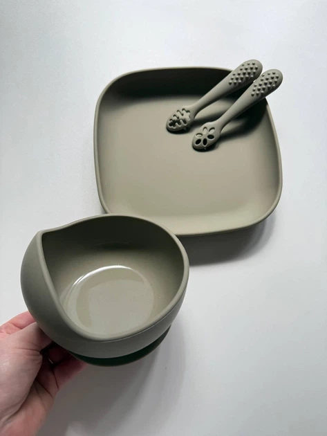 Набір дитячого силіконового посуду на присосках | Посуд для першого прикорму з пре-спун pre-spoon Світлий хакі