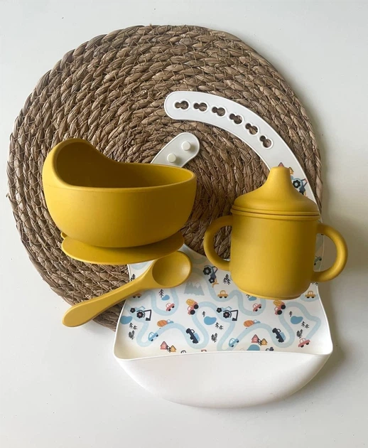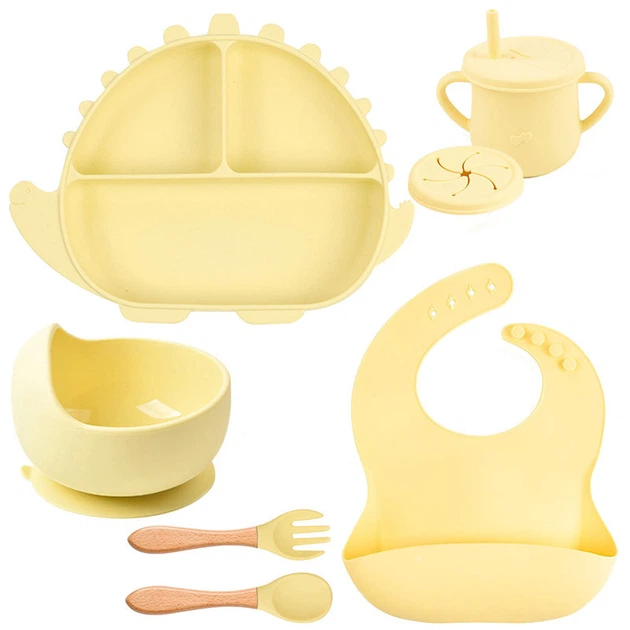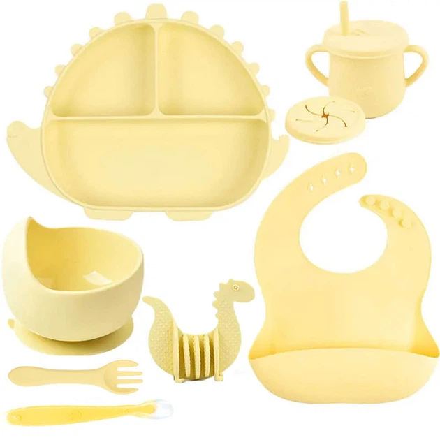 Набір дитячого силіконового посуду 2Life Y11 Динозавр із 8 предметів з іграшкою-прорізувачем Жовтий v-13385