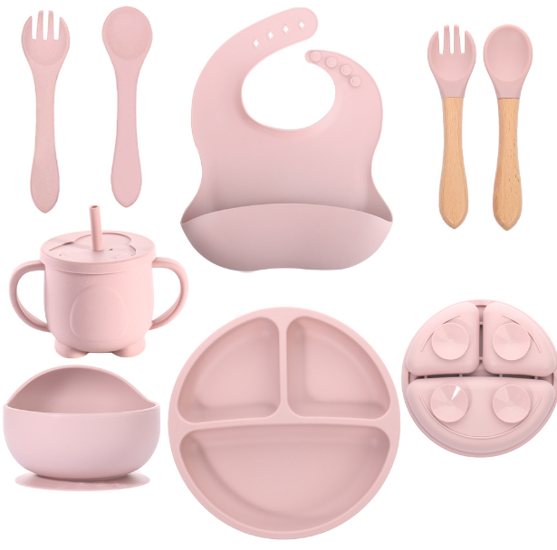Набір силіконової посуди Korni для найменших 8 предметів дитячий посуд для годування рожевий (SVS)