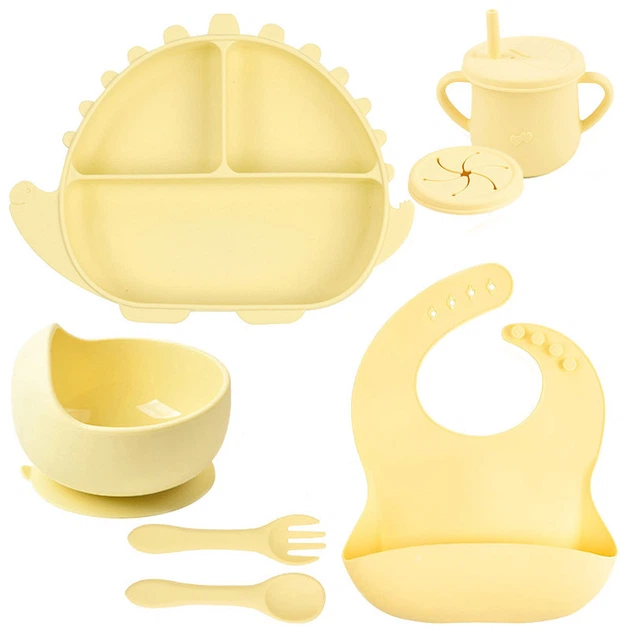 Набір силіконового посуду 2Life Y11 трьохсекційна тарілка Динозавтр поїльник прибори слюнявчик Жовтий v-11215