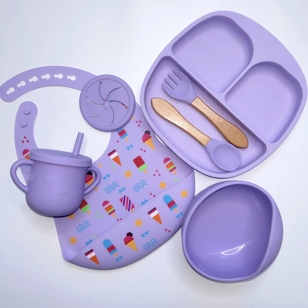 Набір силіконового посуду для прикорму для дівчинки 7 предметів колір Лаванда ВР 176, нагрудник принт Цяточки