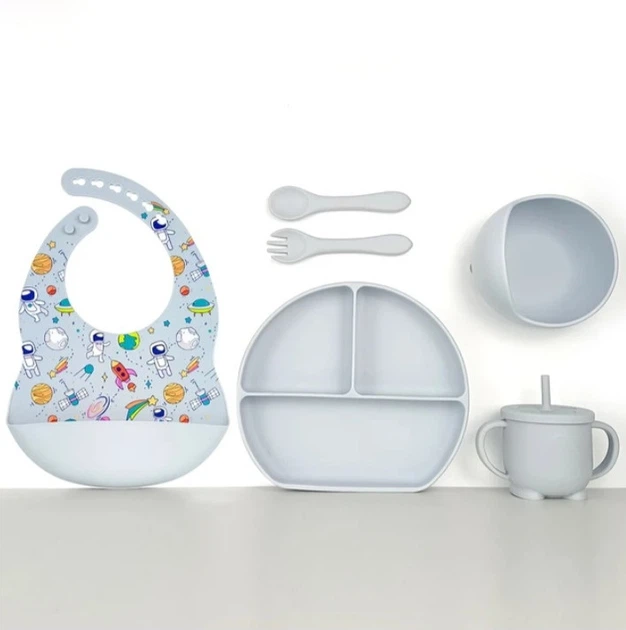 Набір дитячого силіконового посуду з нагрудником космос 6 предметів Сірий світлий