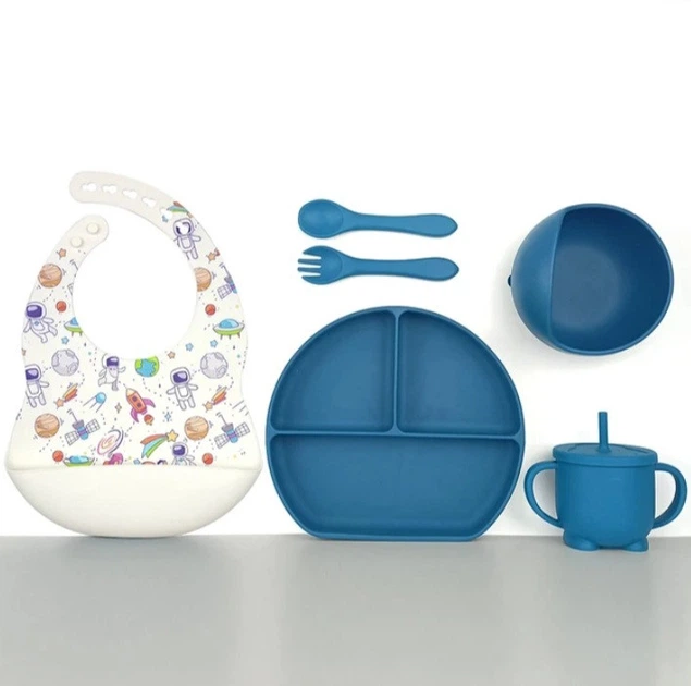 Набір дитячого силіконового посуду для першого прикорму Космос 6 предметів Синій океан