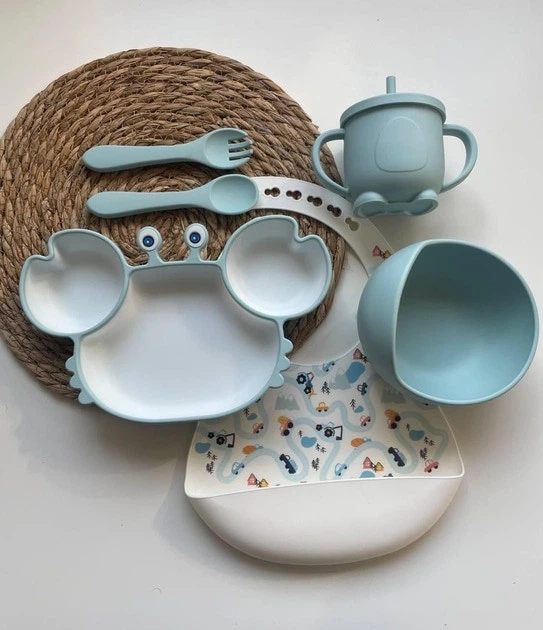 Набір дитячого посуду для годування з крабом біле дно та нагрудником машинки Блакитний