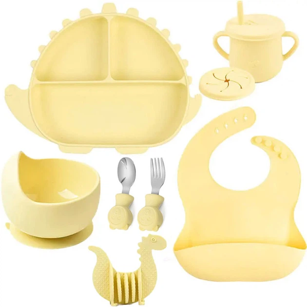 Набір дитячого посуду 2Life Y11 для першого підгодовування дитини з металевими приладами та прорізувачем Динозавр Жовтий v-1