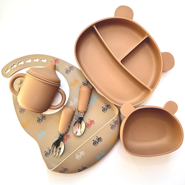 Посуд силіконовий для прикорму 9 предметів ВР239 колір Гірчичний, нагрудник однотонний
