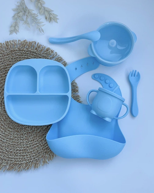 Набір силіконового посуду для прикорму для хлопчика 6 предметів колір Синій ВР169, нагрудник однотонний