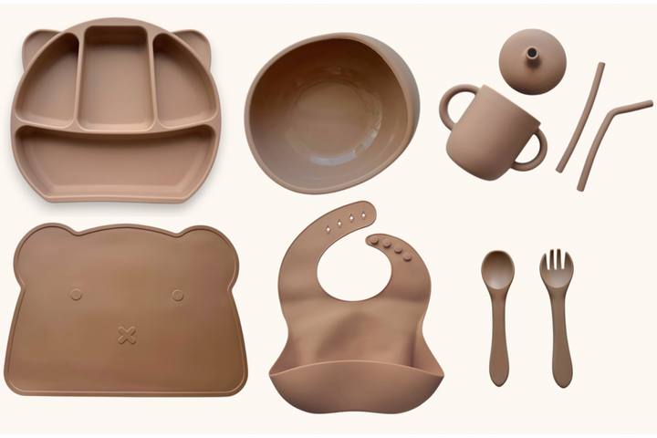 Набір дитячого силіконового посуду "Базовий з вушками з килимком" Капучіно (2770383017)