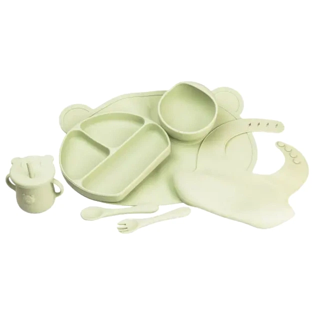 Дитячий набір силіконового посуду 7 предметів Зелений для годування малюка безпечний посуд для дітей (523335)
