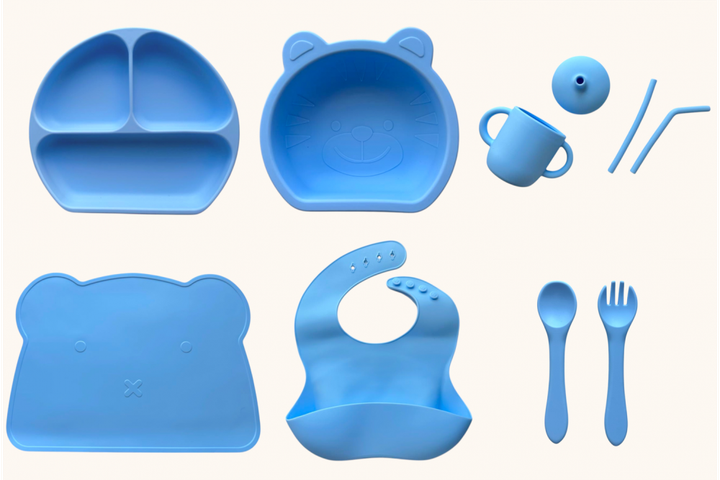 Набір посуду (слинявчик, ніблер, поїльник, глибока тарілка, силіконові прибори) бебі блю