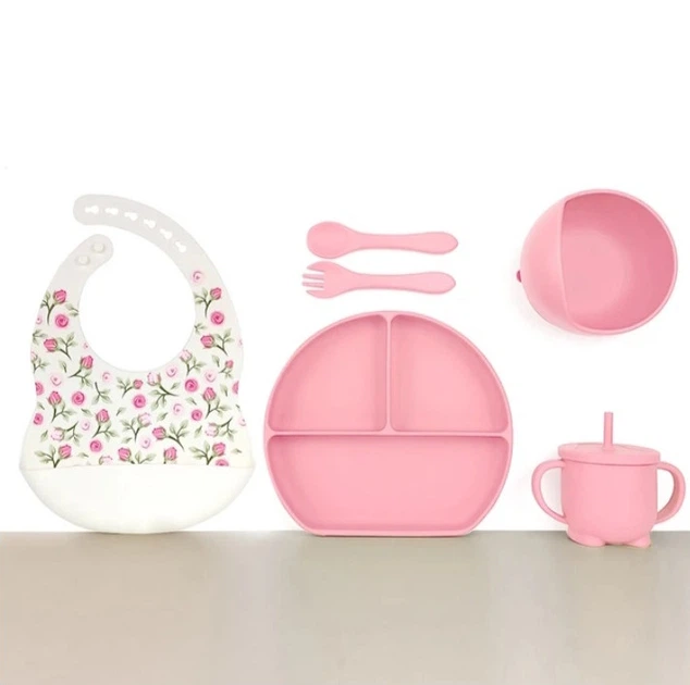 Набір дитячого силіконового посуду для годування з нагрудником квіти 6 предметів Рожевий