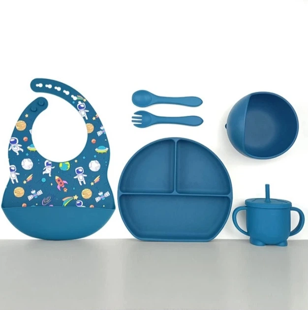 Набір дитячого силіконового посуду для першого прикорму Космос 6 предметів Синій океан