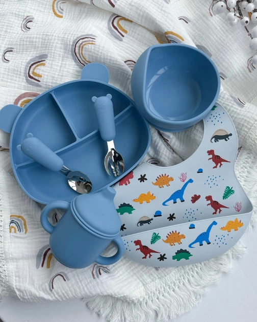 Посуд силіконовий для прикорму набір 6 предметів колір Синій ВР812, тарілка Ведмедик без кришки, нагрудник Синьо-сірий принт