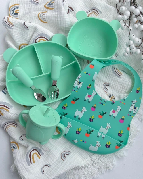 Посуд силіконовий для прикорму набір 6 предметів колір М'ятний ВР822, тарілка Ведмедик без кришки, нагрудник принт Лами