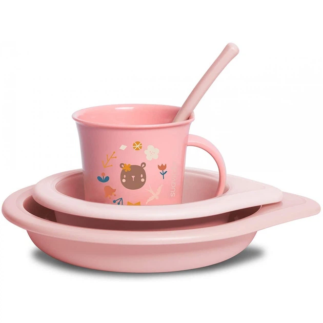 Посуд силіконовий для прикорму набір 6 предметів колір Пудра ВР815, тарілка Ведмедик без кришки, нагрудник принт Единоріжки