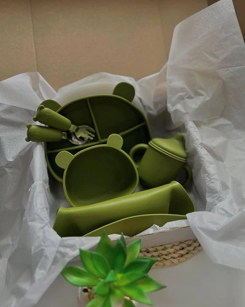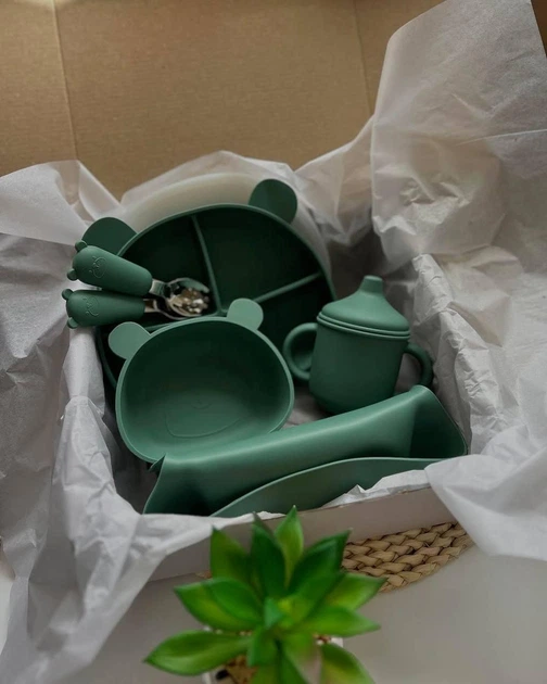 Дитячий силіконовий посуд для прикорму на присосках, набір дитячого посуду, нагрудник, секційний, глибокий Темно-зелений