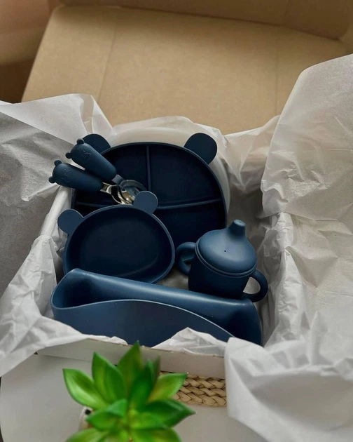 ячий силіконовий посуд для прикорму на присосках, набір дитячого посуду, нагрудник, секційний, глибокий Темно-синій