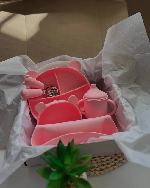 Набір дитячого силіконового посуду на присосках класичний малиновий Пакунок малюка