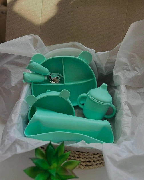 Дитячий силіконовий посуд для прикорму на присосках, набір дитячого посуду, нагрудник, секційний, глибокий М'ятний