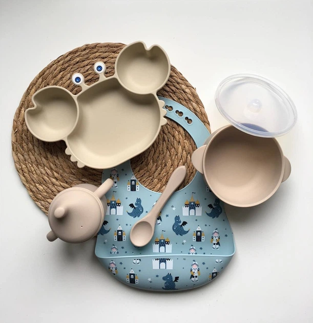 Набір дитячого силіконового посуду для першого прикорму Крабик бежевий та глибокою тарілкою з кришкою і нагрудником лицарі