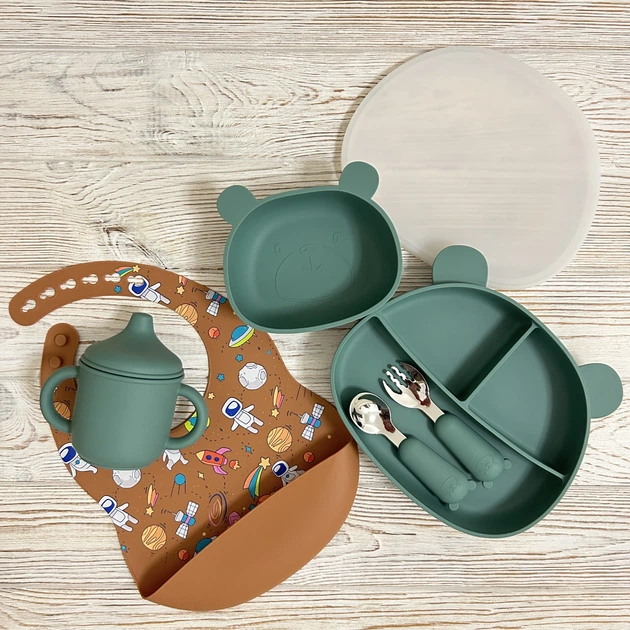 Набір дитячого силіконового посуду для першого прикорму Крабик синьо-зелений та глибокою тарілкою з кришкою і нагрудником ди