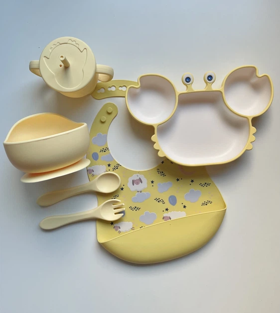 Набір дитячого силіконового посуду Крабик жовтий принт ягнята