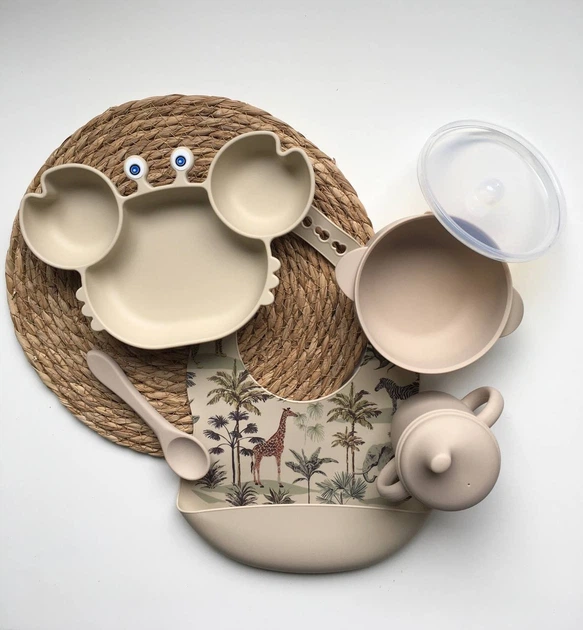 Набір дитячого силіконового посуду для першого прикорму Крабик бежевий з глибокою тарілкою і кришкою та нагрудником сафарі