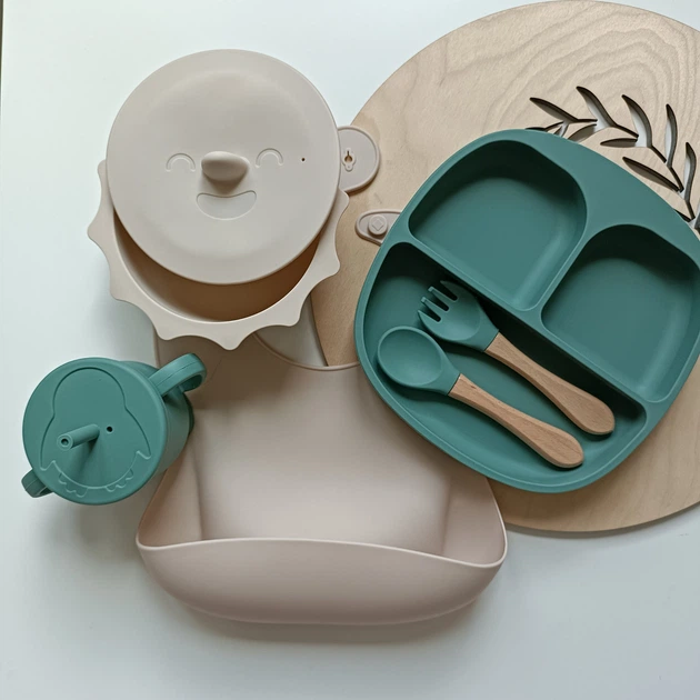 Класичний набір посуду для малюка для прикорму оіл грін та беж 7 од (0118)
