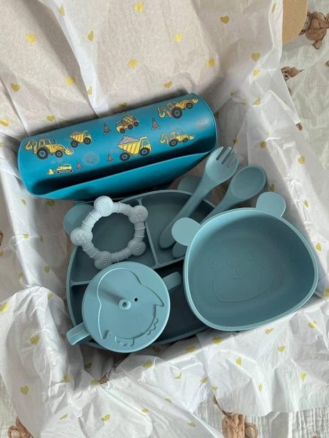 Набір посуду (слинявчик, ніблер, трисекційна тарілка, силіконові прибори, глибока тарілка) бебі блю