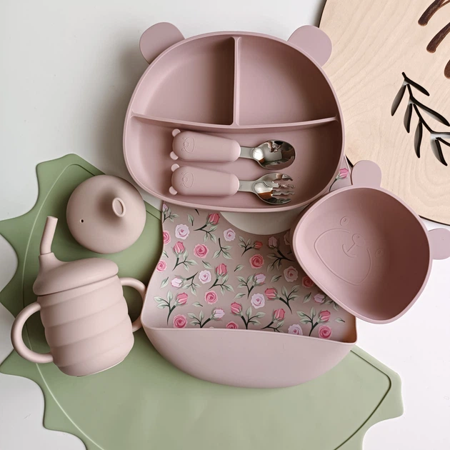 Набір дитячого силиконового посуду із 7 предметів із безпечного, харчового силикону Пудровий