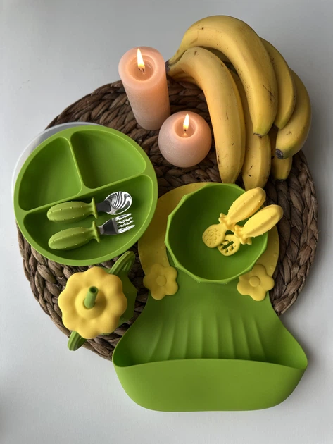 Набір дитячого посуду Ведмедики зелений та нагрудник із еко-шкіри з рукавами сафарі