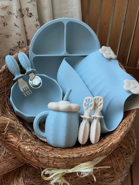 Набір дитячого посуду Ведмедики синій та нагрудник із еко-шкіри з рукавами сафарі