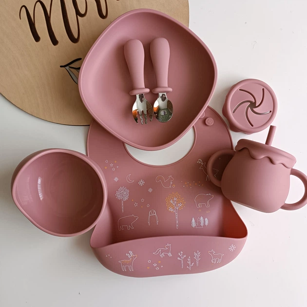 Набір посуду для малюка Темно-рожевий 7 шт Дитячий набір для годування Посуд для дитини до року (0287)