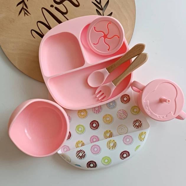 Набір дитячого посуду для першого прикорму для дівчинки Рожевий Роза кварц Пончики (0111)