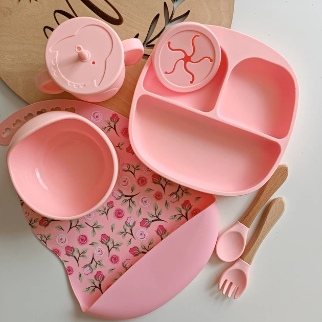 Набір дитячого посуду для першого прикорму для дівчинки Рожевий Роза кварц Рожеві троянди (0112)