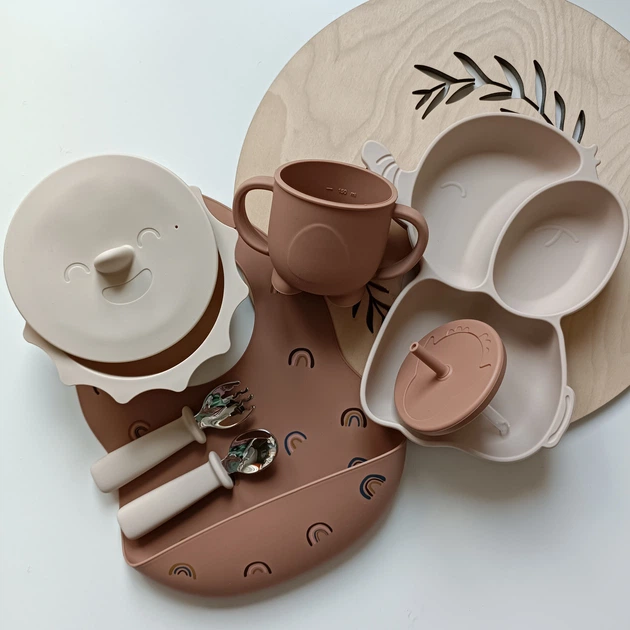 Набір дитячого силіконового посуду для прикорму Єнотик Беж Посуд для діток Дитячий набір для прикорму (0142)