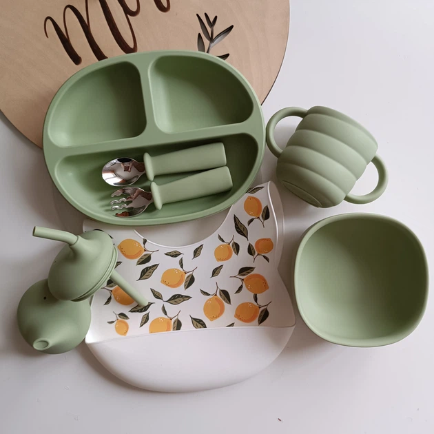 Набір посуду для малюка Оливковий 9 шт Якісний силіконовий посуд для дітей Посуд для немовлят із силікону (0101)
