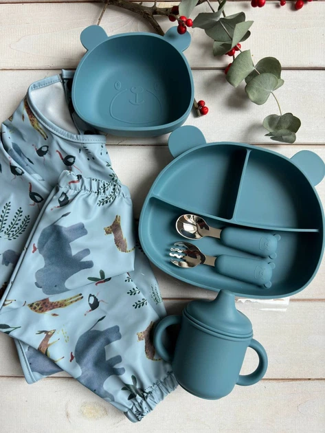 Набор посуду (слинявчик, поїльник, ніблер, металеві прибори, трисекційна тарілка, глибока тарілка) бебі блю