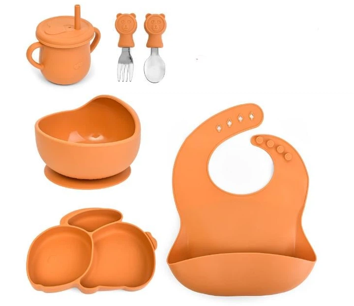 Набір посуду дитячого силіконовий "Зайчик" 6 предмети (виделка, ложка, чашка з соломинкою, слинявчик, тарілки 2 шт.) помаран