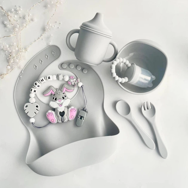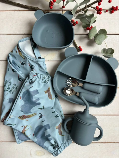 Дитячий силіконовий посуд Ведмедик у темно-сірому кольорі Фартух для творчості Перший набір дитячого посуду (0130)