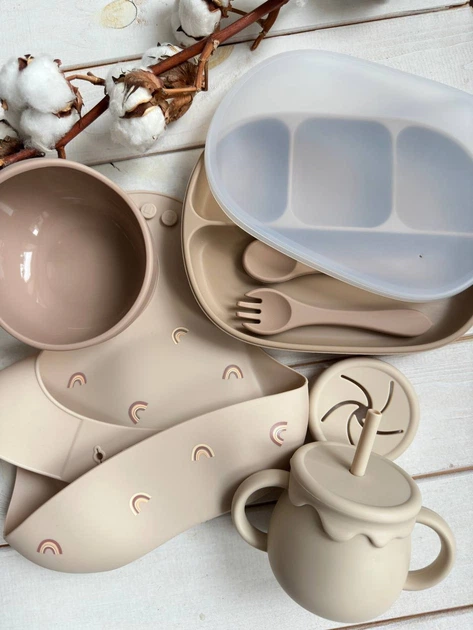 Набір дитячого посуду для прикорму Капучино/Беж Дуже красивий набір посуду для дітей Зручний набір для їжі 8 од (0018)