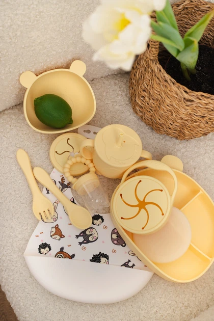 Великий набір силіконового посуду для дітей на присосках жовті звірята з ніблером