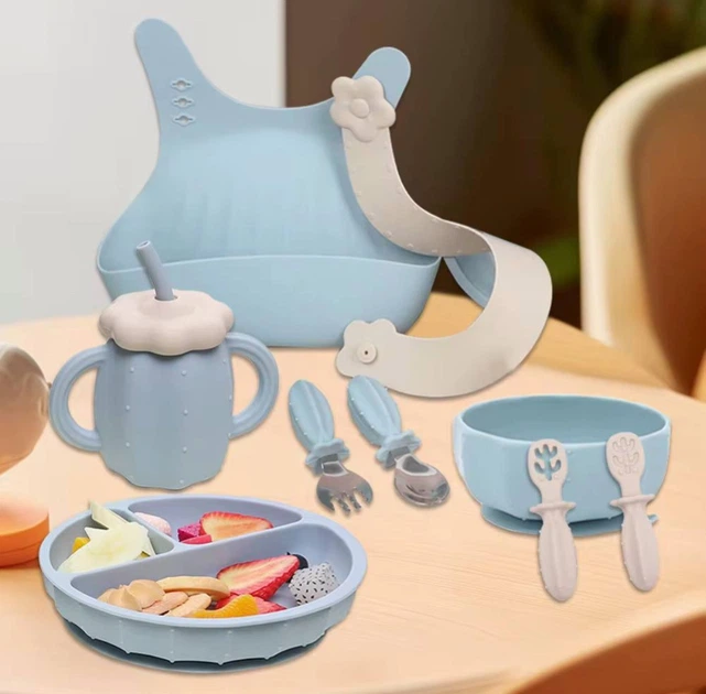 Набір дитячого силиконового посуду із 8 предметів із безпечного та харчового силикону Powder blue