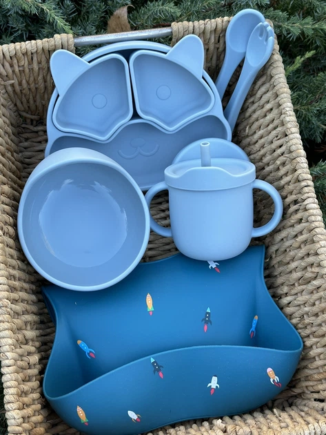 Набір силиконового посуду для дітей на 8 предметів із якісного, безпечного, харчового силикону Blue