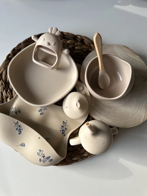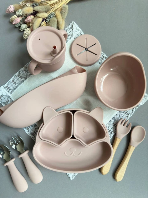 Набір посуду для малюка Єнотик Пудра 9 шт Силіконовий набір для першого прикорму Посуд для першого прикорму (0004)