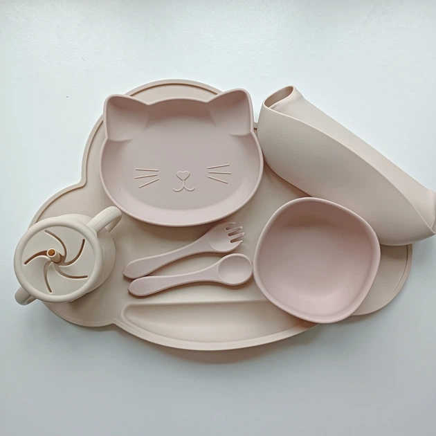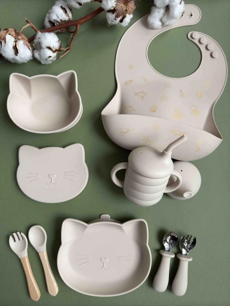 Набір посуду для малюка Котик Бежевий 9 шт Дитячий посуд для каші та пюре Силіконовий набір посуду для малюка (0302)