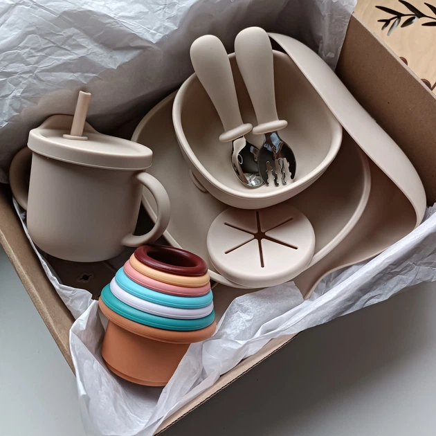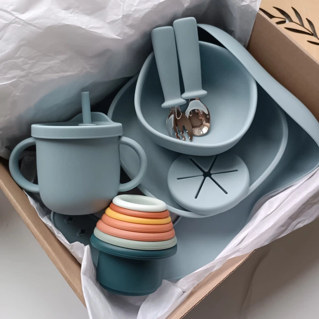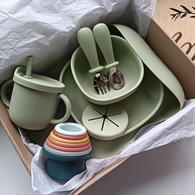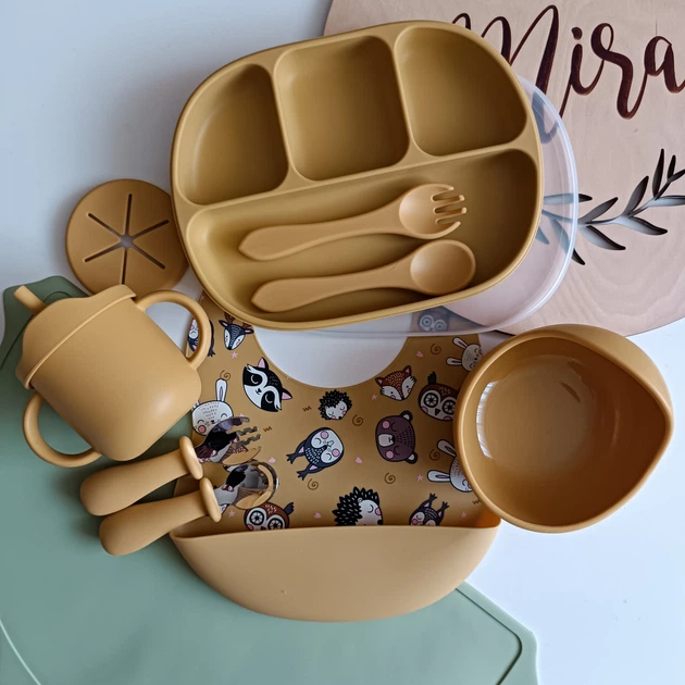 Набір посуду для малюка Хакі 8 шт Силіконовий набір посуду для малюків від 1 року Зручний посуд для дитини (0426)