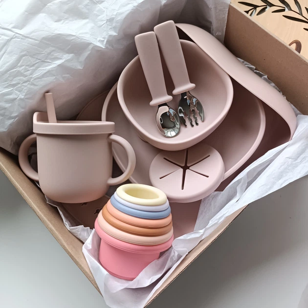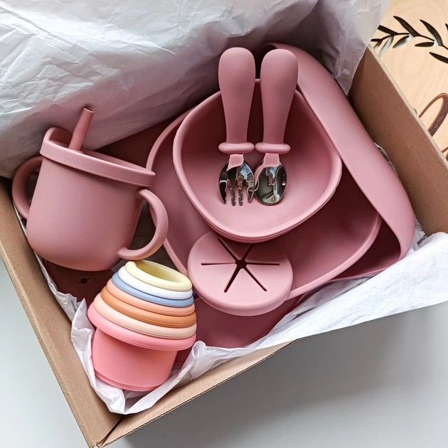 Силіконовий посуд для дівчинки 8 в1- комплект на присосках Пудра (0308)