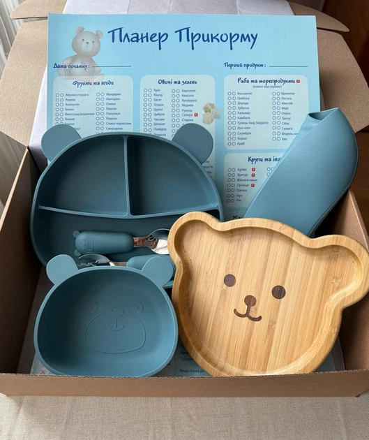 Набір посуду для малюка Ведмедик 0439 Синій 7 шт Комплект посуду для малюка Посуд для малюка з розділовою тарілкою