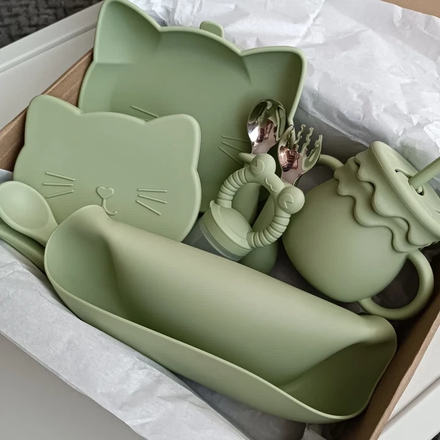 Набір посуду для малюка Котик Оливковий 11 шт Дитячий посуд для навчання самостійному харчуванню (0212)